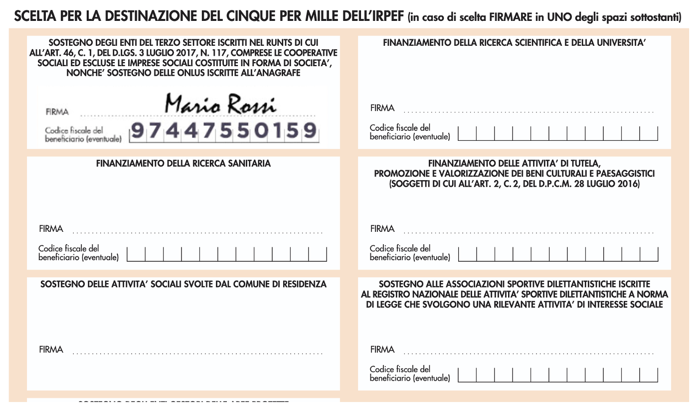 2. firma nel riquadro indicato come “Sostegno del volontariato e delle altre organizzazioni…”;