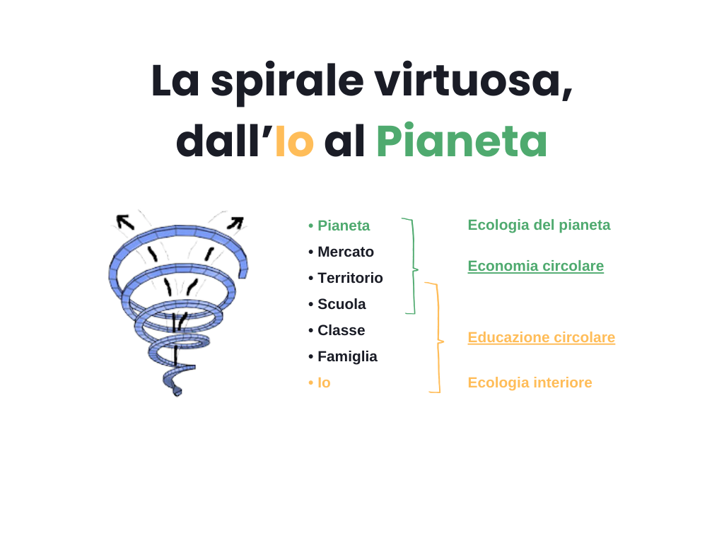 L’economia lineare produce, consuma ed scarta ciò che smette di funzionare, ma la scuola non può fare lo stesso. Abbiamo chiamato educazione circolare una spirale virtuosa di produzione di conoscenza e competenza che non scarta niente e nessuno ma rimette in circolo chi è diverso o svantaggiato in una comunità aperta ed estesa al territorio.